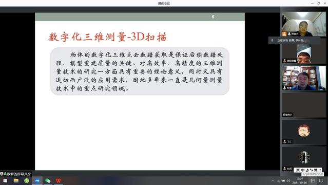 欧副教授首先结合“恐龙遗址复原”等经典案例回顾了3D扫描技术的发展历史,然后从煤堆用量估计、古塔三维重构、鞋模个性化定制等方面介绍了团队在光电检测与3D扫描领域的最新研究成果,并对3D扫描在工业应用进行了展望分析。欧副教授团队严谨的治学态度和实事求是的学术作风给所有参会师生留下了深刻印象。