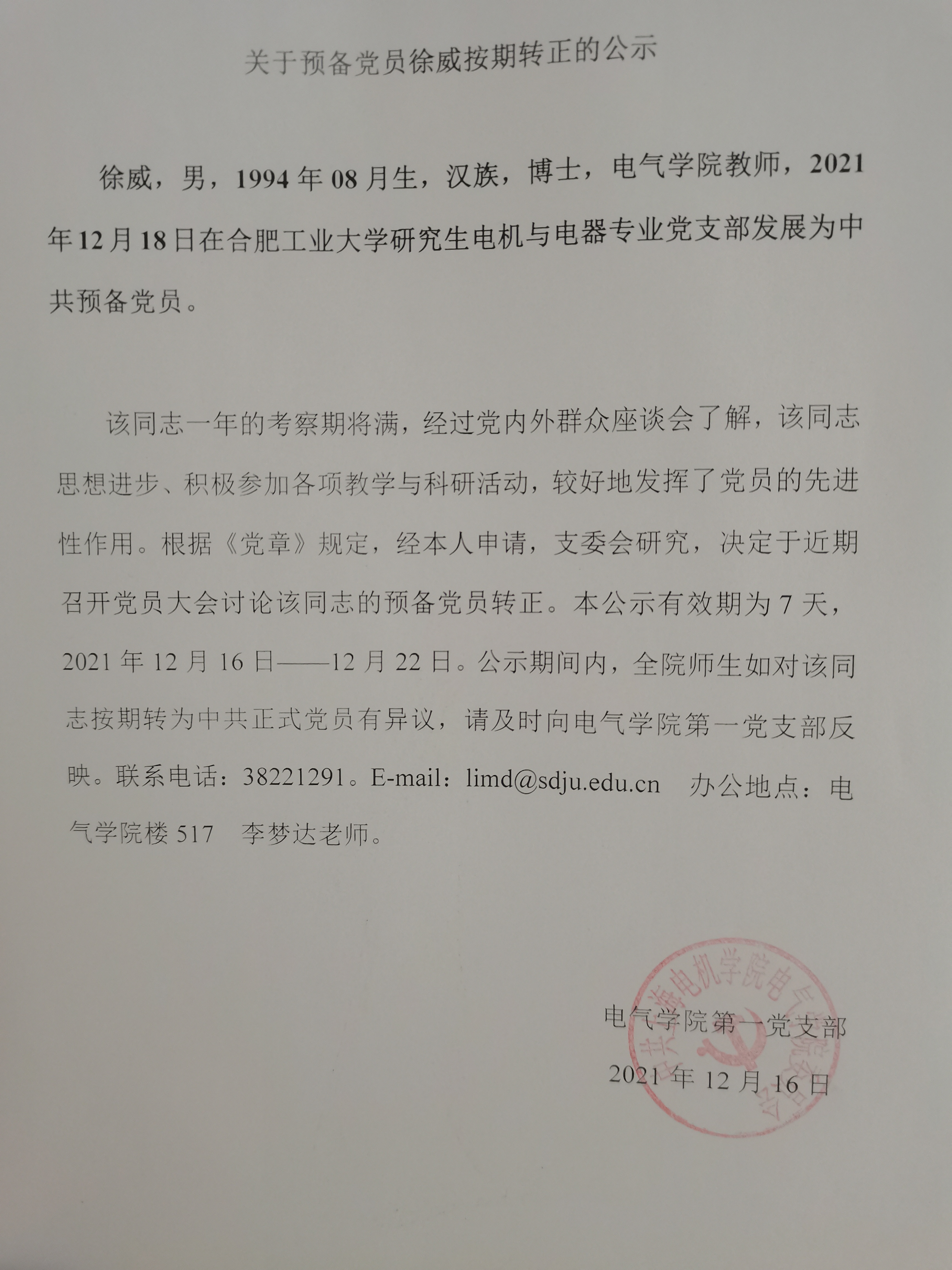 关于徐威按期转正的公示