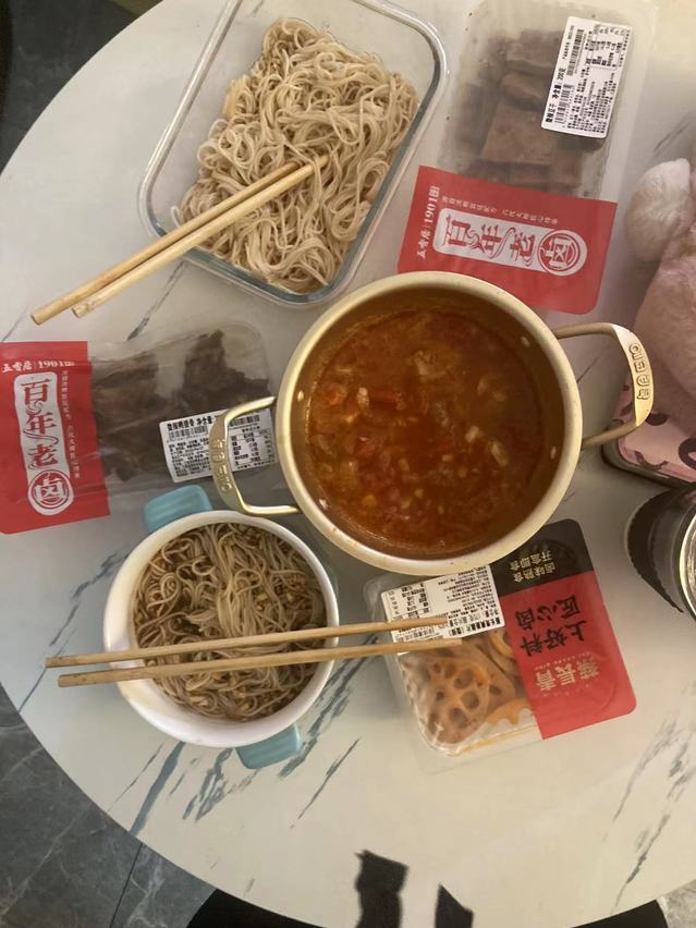 今天是五一劳动节,我决定为爸妈做一顿饭,由于疫情当下物资缺乏,在综合了家里的物资后,我打算做一道番茄牛腩面和一道凉拌面。说干就干,首先是凉拌酱料的调制,蒜是必须要的,再加点酱油、醋、糖、蚝油,一份美味的凉拌料就出来啦;然后是水开下面,煮好后将面用凉水冲冷,再浇上酱汁,一道凉面就好啦。接着是番茄牛腩,因为是昨天晚上做的,今天就是拿出来加热一下,然后浇在面上,一道番茄牛腩面就出炉啦。最后加几份熟食,一顿美味的午餐就大功告成啦!