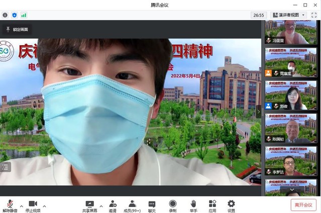 作为研究生代表,张闻东和代阳也对疫情期间他们如何坚持科研学习和实验仿真进行交流,“作为新时代的研究生,我们要向老一辈科学家学习,胸怀祖国、勇攀高峰,新时代的广阔舞台等待着我们去尽情施展才华。我们更要以时不我待的精气神潜心研究,为祖国的发展和强大贡献自己的青春力量”代阳真挚地表达自己的理想信念。