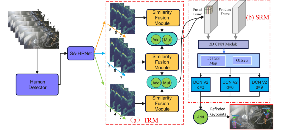 在复杂的工业场景下进行人体姿态估计是具有挑战性的。该场景下的监控视频帧存在亮度不均匀、图像细节模糊和噪声过多等问题。最新主流的人体姿态估计方法对高质量的静态图像具有良好的检测性能,但在工业场景中,模型的准确性和预测率会大幅度降低。针对这些问题,智能决策与控制技术研究团队提出了一种适用于复杂工业场景下的人体姿态估计方法YH-Pose,该框架努力合并来自邻近视频帧的额外视觉证据,以促进当前帧的姿态估计。首先,引入一个人检测器来定位人在视频帧中的位置并提取全局特征。这可以为后面关键点检测提供很好的初始化,使训练过程快速收敛。其次,利用热图对关节位置进行编码为高斯峰值,并设计了一个时间道路模块(TRM),以一定的间隔对视频帧进行编码。该模块通过不同帧率进行分组融合时空信息。最后,空间道路模块(SRM)从融合的关键点上下文特征中进行学习,并预测下一帧中的关键点的位置。此外,团队还提出了一个名为Colliery-1的工业场景人体姿态估计通用数据集,在Colliery-1数据集上的实验结果表明,该框架在训练集和测试集上的平均准确率分别为82%80%。此外,该框架对人体姿态的预测率为94.2%,达到了SOTA,为复杂工业场景下的人体行为识别研究做出了贡献。