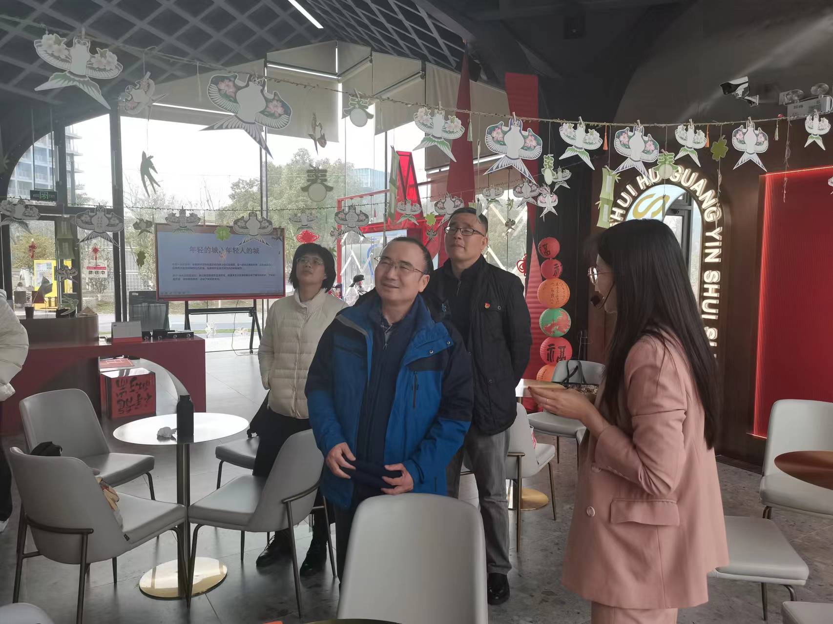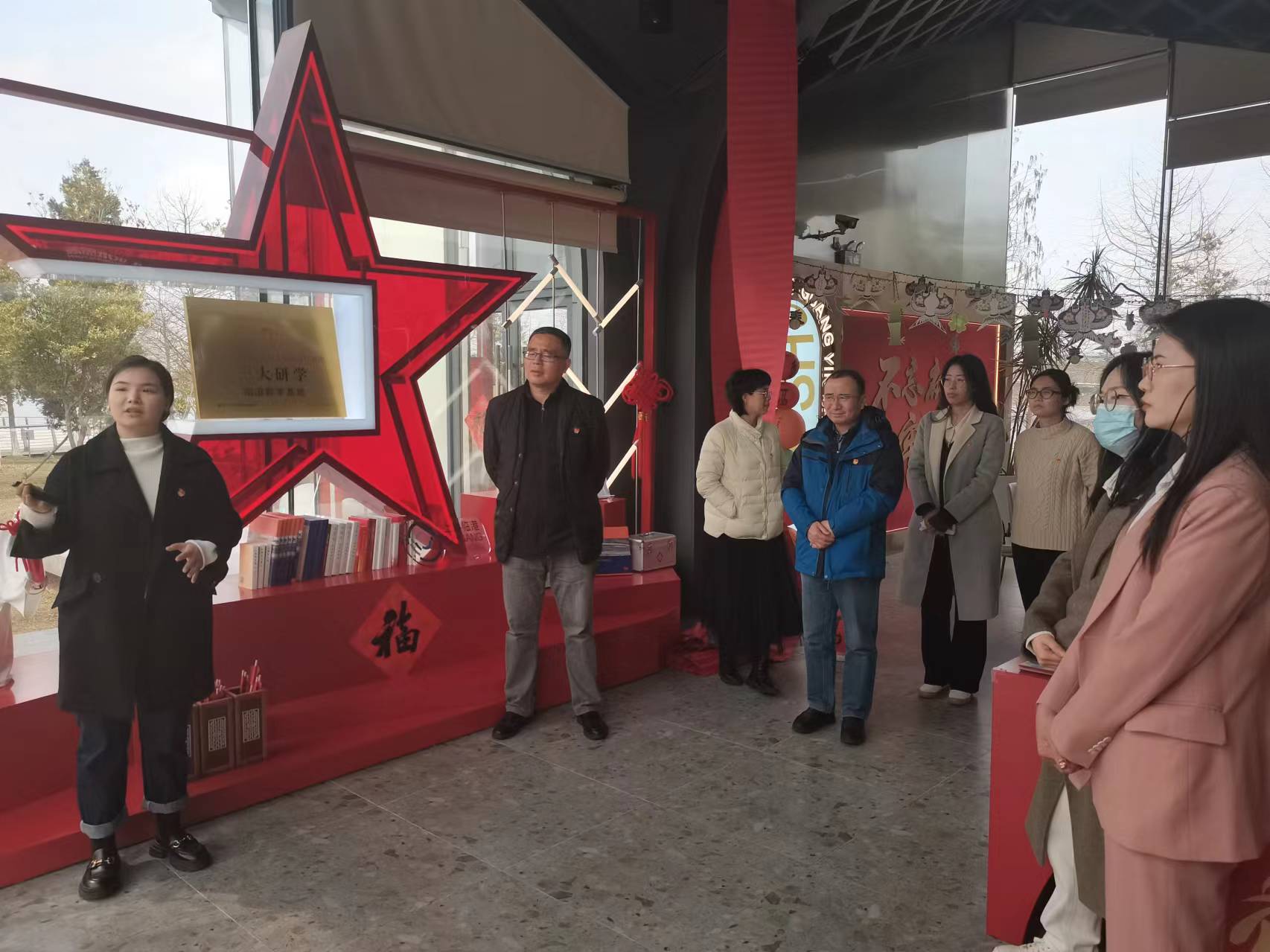 3月7日,ok138cn太阳集团古天乐党委书记陈国初、党委副书记卿海龙带队赴首个“一大研学”教学基地——“滴水•湖光”党群服务站参观学习,ok138cn太阳集团古天乐党支部书记、辅导员、专职组织员参加。在我校校友、临港管委会办公室邱晓慧和服务站刘骏的带领下,通过聆听讲解了解红色IP“一大文创”等品牌,理解中共一大纪念馆所属品牌“一咖啡”所蕴含的革命故事,沉浸式体验“XR元宇宙场景”和“IP数字人”等前沿科技。