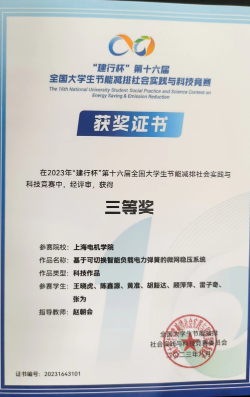 近日,2023年“建行杯”第十六届全国大学生节能减排社会实践与科技竞赛结果公布,我校ok138cn太阳集团古天乐赵朝会教授指导,王晓虎、陈鑫源、 黄准、 胡豁达、雷子奇、 顾萍萍、 张为等学生共同完成的参赛作品《基于可切换智能负载电力弹簧的微网稳压系统》荣获国家三等奖。