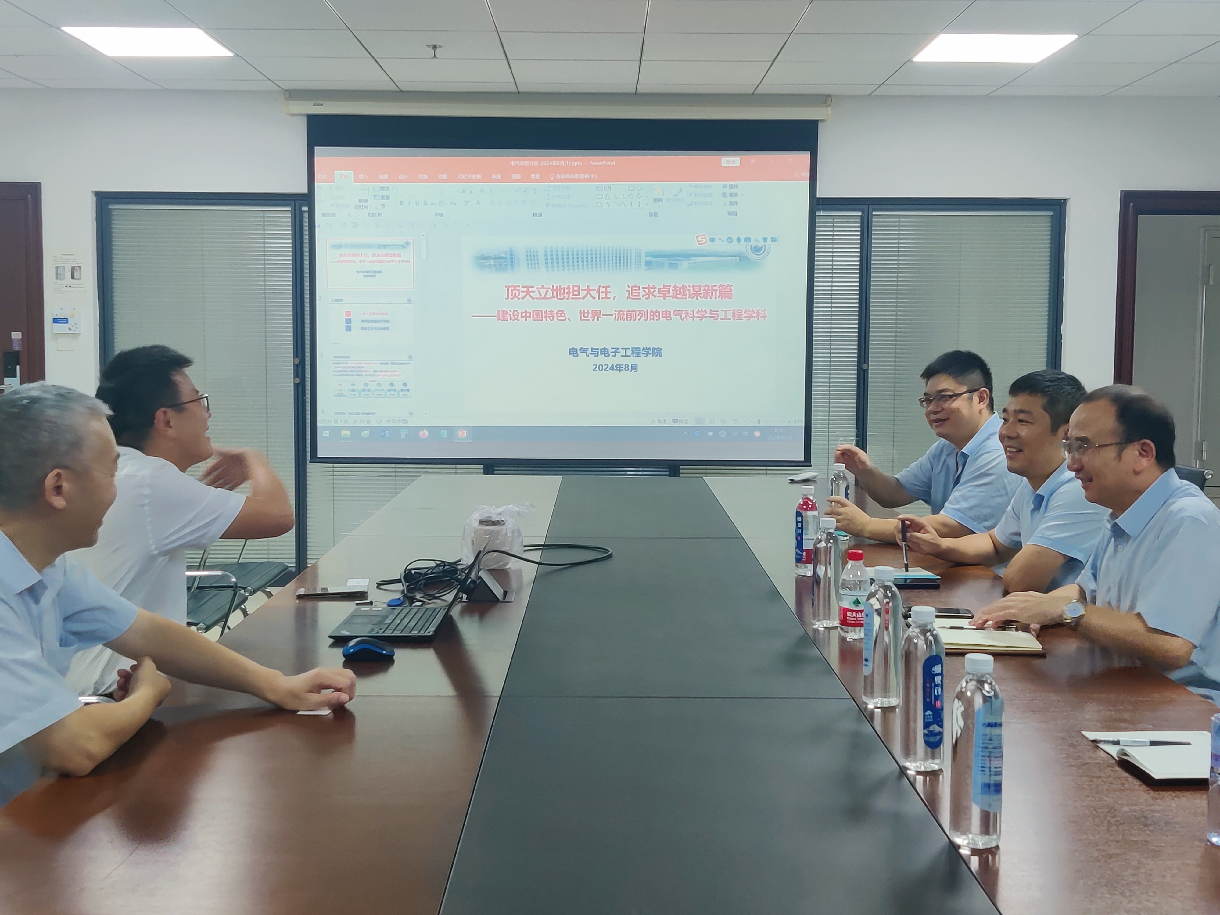 随后,调研一行深入电气与电子工程学院,受到副院长孔武斌教授与电机及控制工程系主任李达义教授等的热情接待。调研会上孔武斌院长作了《顶天立地担大任,追求卓越谋新篇》的介绍,李达义教授详细介绍了电机及控制工程的发展情况,致力于培养电机及控制领域的博士后、博士和硕士等高层次人才,主要从事电机及其控制方向的应用基础研究工作,在电机理论、电磁场理论、新型电机拓扑等方向取得了大量具有国际影响力的研究成果。在深入互动交流环节,双方就学院管理、教师激励与考核、博士点培育建设、人才培养与引进、共建平台与技术合作等展开深入交流,并就电机设计、电机控制,电机的信息管理和运维开展合作进行探讨。学院调研一行还深入学习了对方学院党委入选第二批“全国党建工作标杆院系”培育创建的经验。