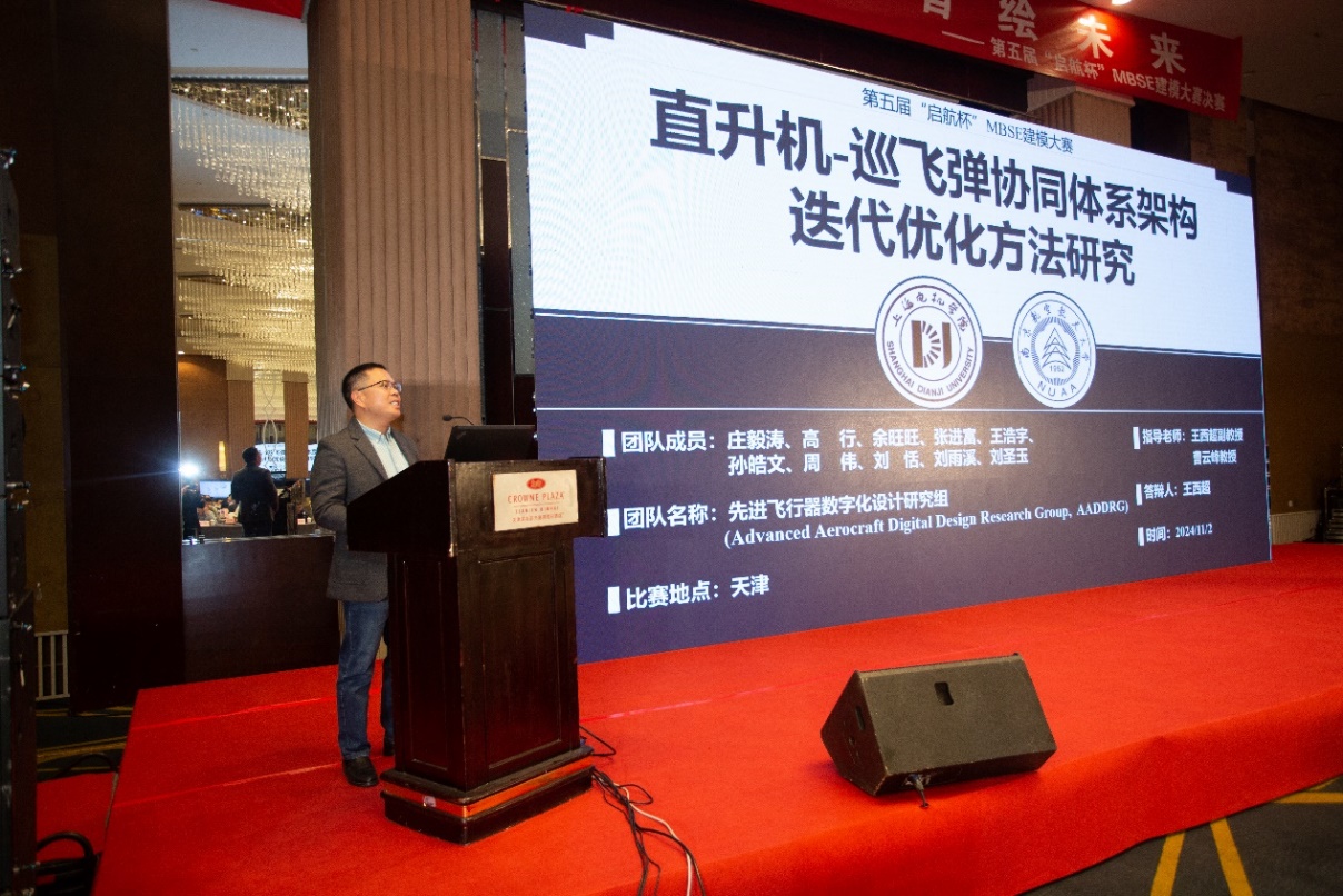 在11月2日的决赛汇报中,王西超老师展示了团队在直升机-巡飞弹协同体系架构迭代优化方法的研究成果,提出了MBSE技术在复杂装备体系研制中的架构优化方法。经过作品展示、专家提问、评委打分、参赛队伍互评等环节,团队最终获取了三等奖的优秀成绩。中国科学院胡海岩院士为获奖团队颁发了奖杯。