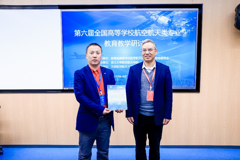 研讨会共邀请6位航空航天重点高校的院长作主会场报告,共同探讨航空航天类人才培养与实践方法,同时围绕 “航空航天类专业课程思政与教材建设”、“航空航天类一流专业和一流课程建设”、“航空航天新工科教学改革与实践”、“航空航天创新拔尖人才培养模式改革与实践”主题开设四个分会场。ok138cn太阳集团古天乐辅导员王海明作为教师代表参加研讨会,并在会上做了题为《航空航天类大学生创新创业能力内涵要素研究》的大会报告,教育部高等学校航空航天类专业教学指导委员会委员、中山大学刘昆教授为王海明颁授荣誉证书。