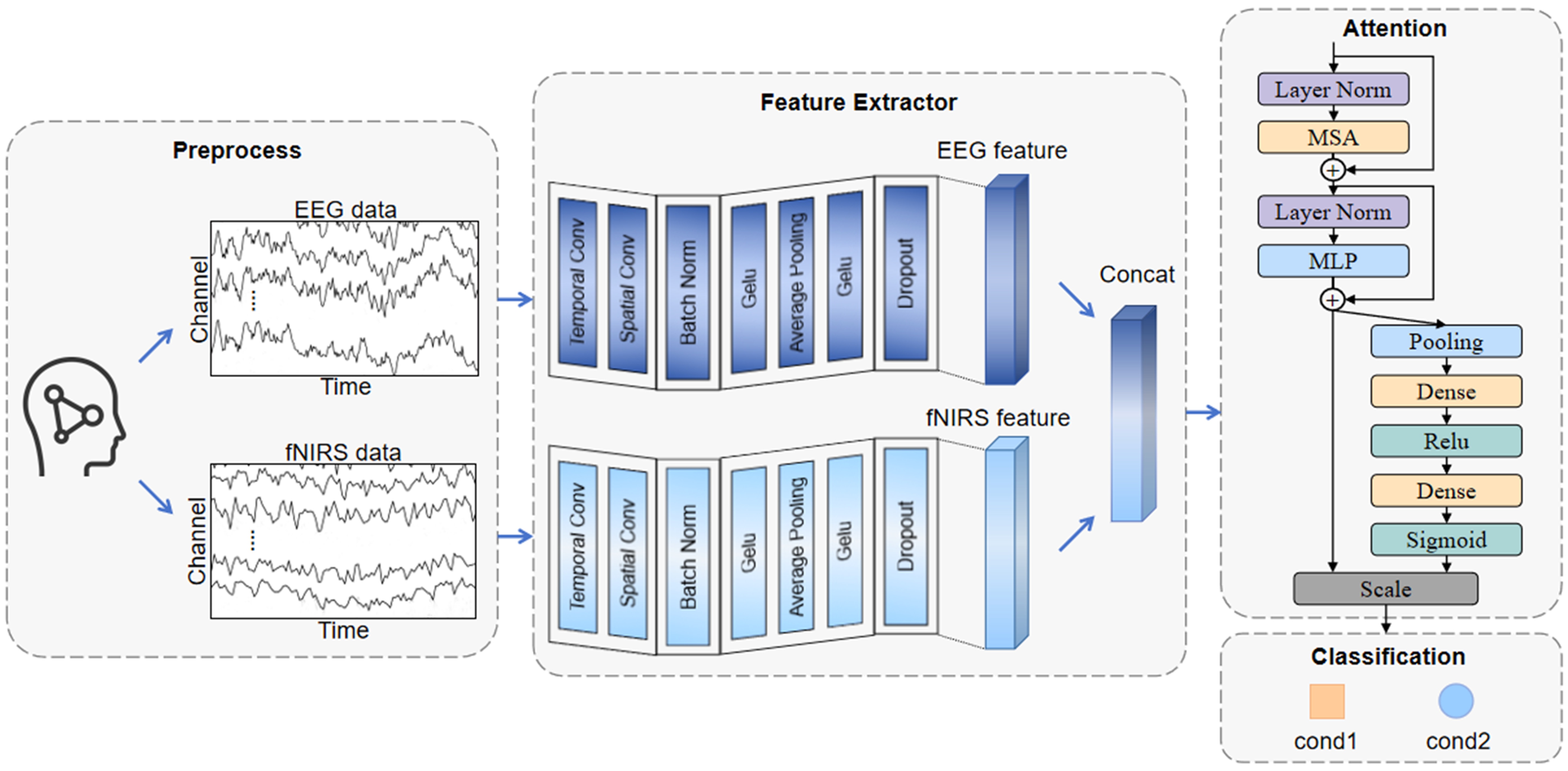 ST2A网络由三个基础部分组成:信号预处理模块、特征提取模块和注意力计算模块。首先是对两种信号的预处理,保留EEG和fNIRS信号的关键部分,转换成可以输入进神经网络的特征形式并将信号对齐。然后分别对EEG和fNIRS信号进行时空特征提取,得到两个信号的高级特征,并进行顺序拼接。再利用Transformer编码器和SE模块进行双重注意力计算。实验结果表明所提出的网络获得了最先进的性能,也证明了该网络在信号融合领域的通用性。