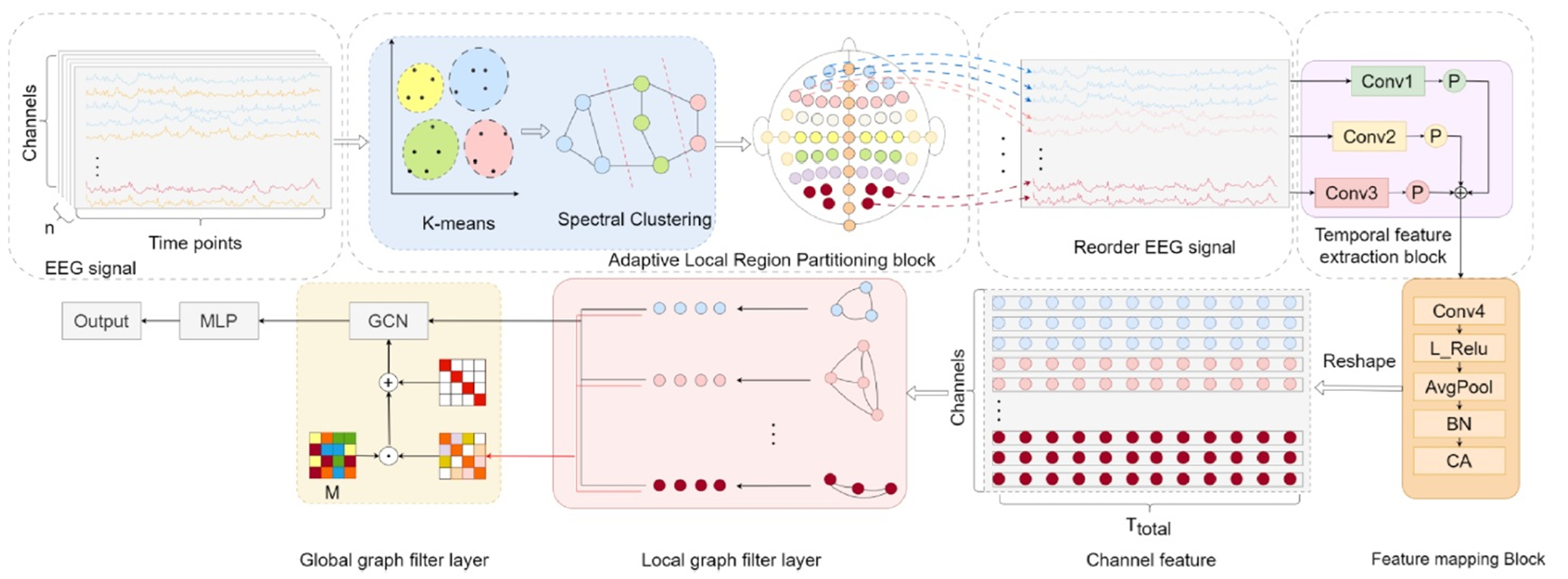 大脑是一个由神经元、局部回路和功能区组成的复杂系统。神经通路连接不同的区域并协作完成复杂的认知和行为功能。EEGNet被认为是一种非常成功的基于卷积网络的融合脑电图(EEG)信号解码模型。但是有两点可以改进:首先,激活的大脑区域可能因不同的BCI任务而异;其次,高密度脑电图信号有可能提供更丰富的大脑信息。然而目前的大多数研究只是将来自不同通道的EEG信号叠加在一起,忽略了脑模型上EEG电极的空间关系以及不同脑功能区域之间的功能连接。